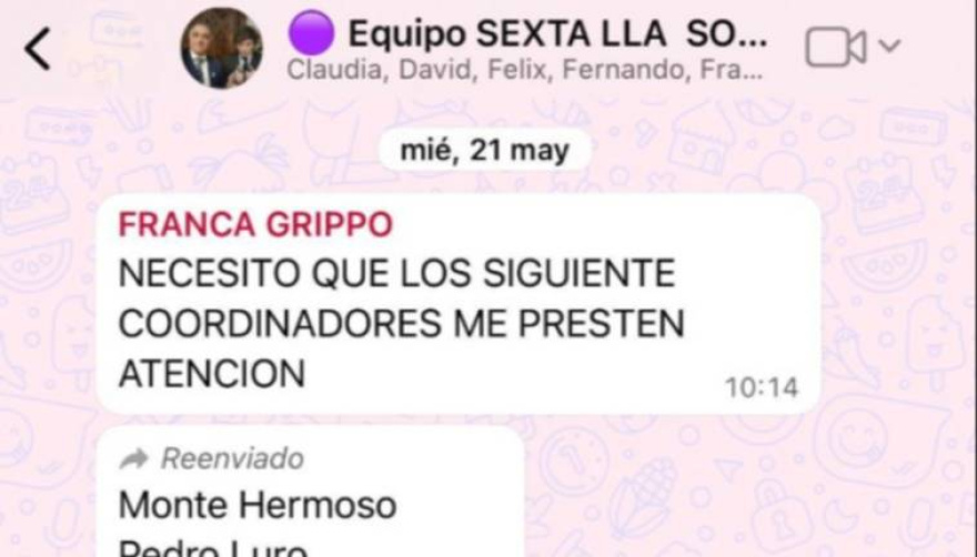 En los mensajes, Grippo Harrington se comunicaba con referentes de distintas localidades de la región y planteaba la posibilidad de cubrir vacantes con “gente de confianza”. “Podemos capitalizar eso nosotros con nuestra gente”, se lee en uno de los chats difundidos. También se observa el pedido a coordinadores para que envíen currículums de una o dos personas para esos cargos.