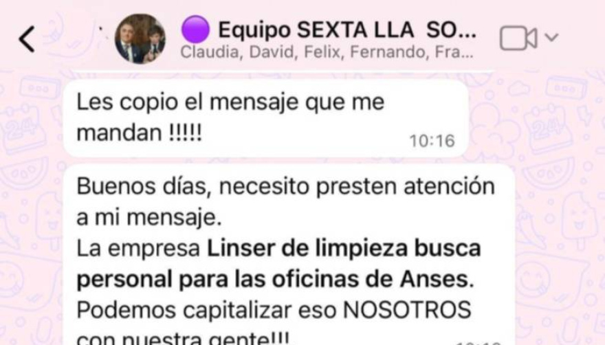 La situación comenzó a tomar estado público anteayer, tras la difusión del tema por parte del sitio La Política Online, y se profundizó con la circulación de capturas de un grupo de WhatsApp del espacio libertario. En esos intercambios se coordinaban acciones relacionadas con la campaña de septiembre pasado y se mencionaban gestiones vinculadas a puestos laborales en la empresa Linser, encargada del servicio de limpieza para la ANSES.