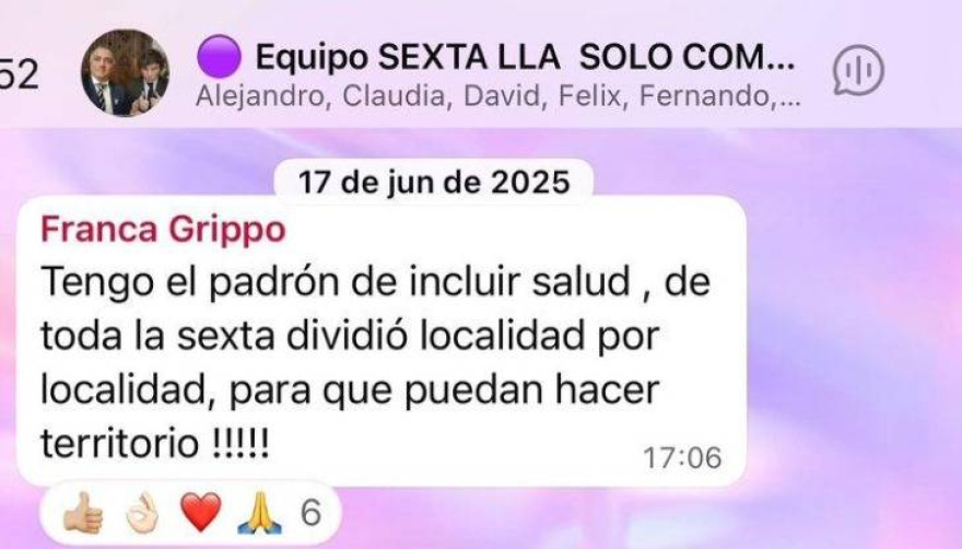 Otro de los puntos que generó repercusión fue la referencia a información de beneficiarios de la ANDIS. En los chats, Grippo Harrington afirmaba contar con esos datos y ponerlos a disposición para tareas territoriales. Desde La Libertad Avanza explicaron que dicha información no tenía fines proselitistas y que se compartió en el marco de una auditoría que se realizaba en ese organismo para verificar que los beneficiarios del programa Incluir Salud cumplieran con los requisitos correspondientes.